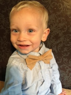 This could be a DIY that you over think and make hard so don't make it like that!! All I did was cut a chunk of leather (sleeves off a leather coat I made into a vest) and measured a length that I liked on Mac. Since he's only 15 months he has a smaller bow tie than a ten year old. I then pinched right in the middle of the square and the accordion folded both sides twice. Once I had all the folds about the same I glued them together with hot glue. I then took a thin strip of leather and glued it around the middle. I didn't have any clips or else I would've used those to clasp the tie on the shirt so all I did was take another long piece and glued the middle of that on the back of the bow tied to be safety pinned together around his neck.